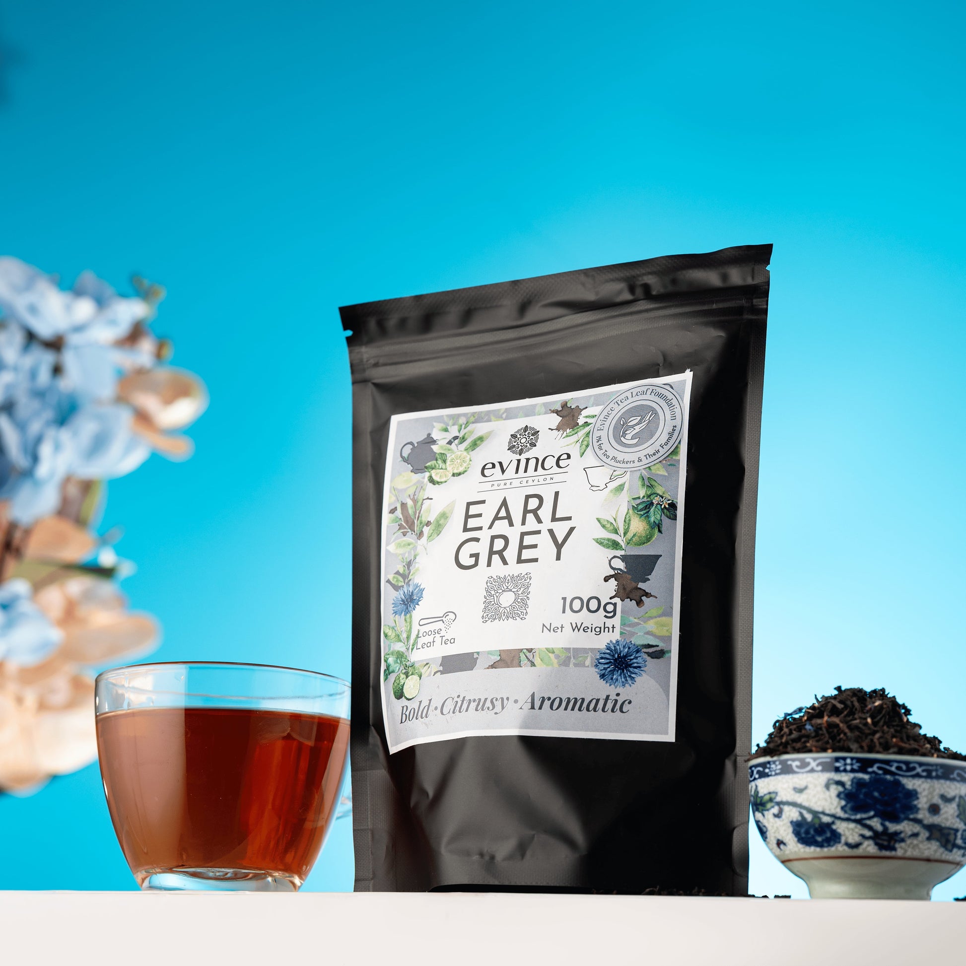 Our Earl Grey is crafted with high-quality Ceylon black tea from the lowlands of Sri Lanka, blended with real bergamot essential oil and natural blue cornflower petals for a refined, aromatic experience.