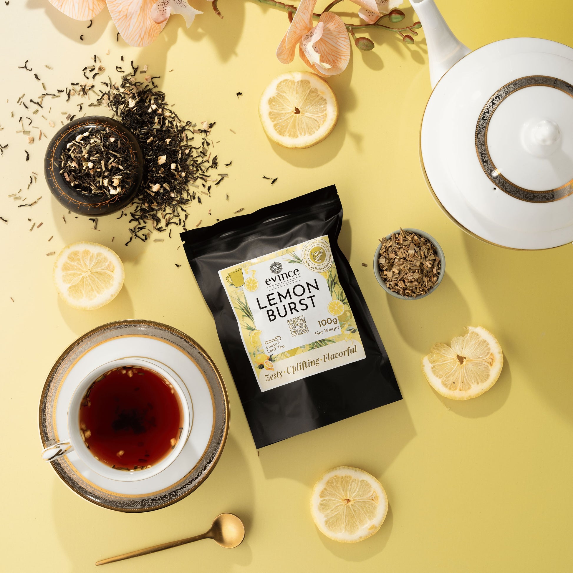 Lemon Burst offers a vibrant, zesty flavor profile with bold Ceylon black tea notes complemented by citrusy lemongrass, lemon myrtle, and lemon peel.