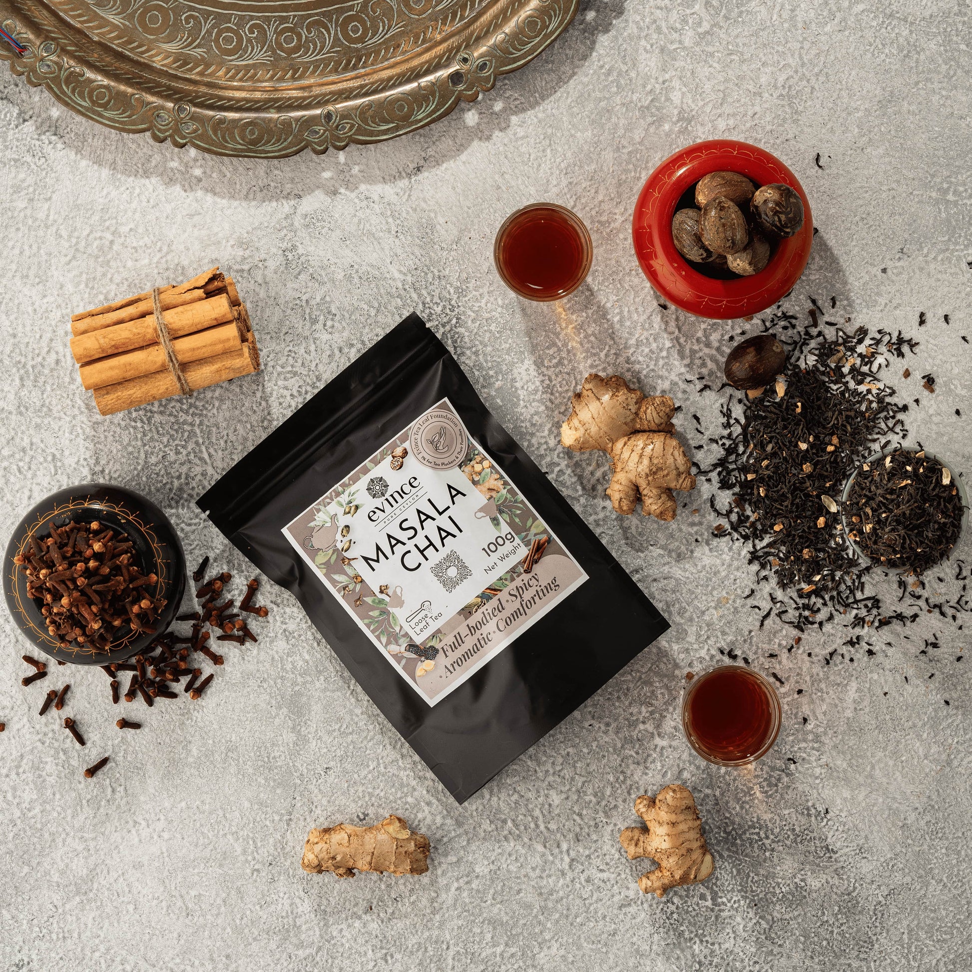 Masala Chai is a traditional Indian spiced tea made by blending black tea with aromatic spices like cloves, cinnamon, cardamom, nutmeg, black pepper, and ginger. Evince’s version uses premium Ceylon black tea for a rich and bold base.