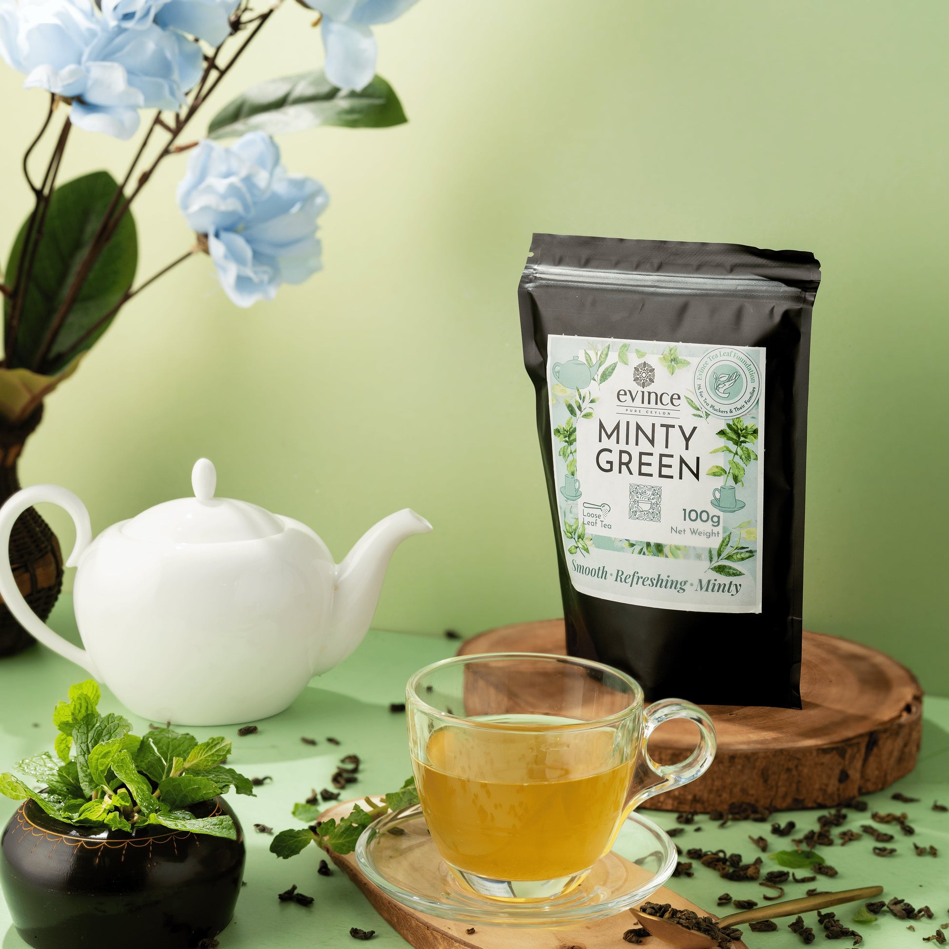 Minty Green is a refreshing blend of Ceylon green tea, natural mint leaves, and peppermint flavor extract. It offers a smooth and revitalizing taste with a crisp minty finish.